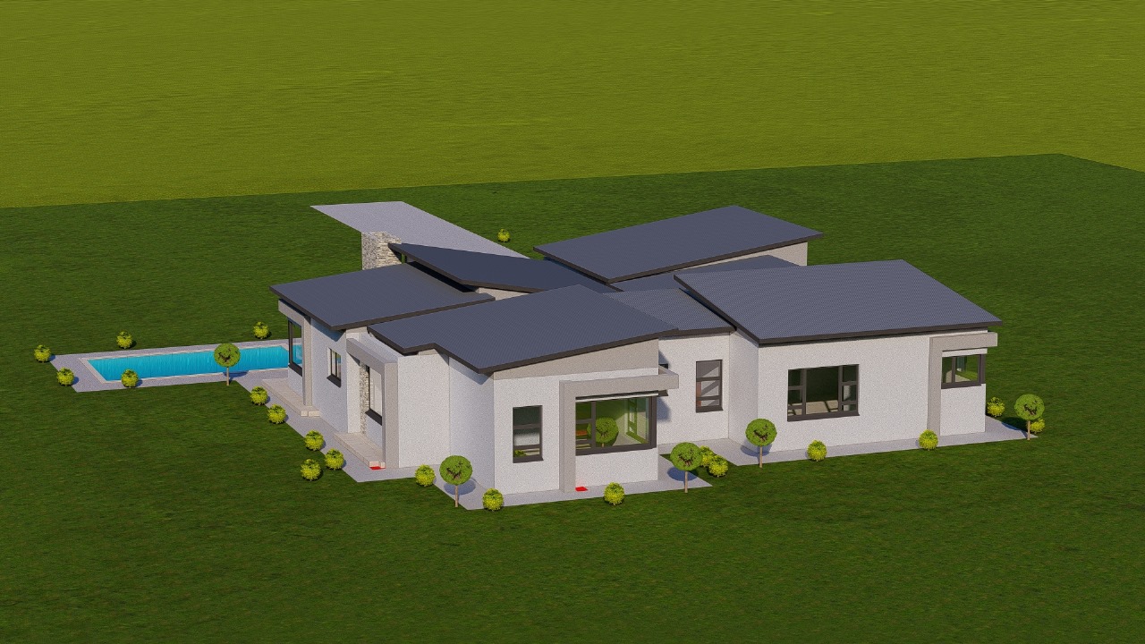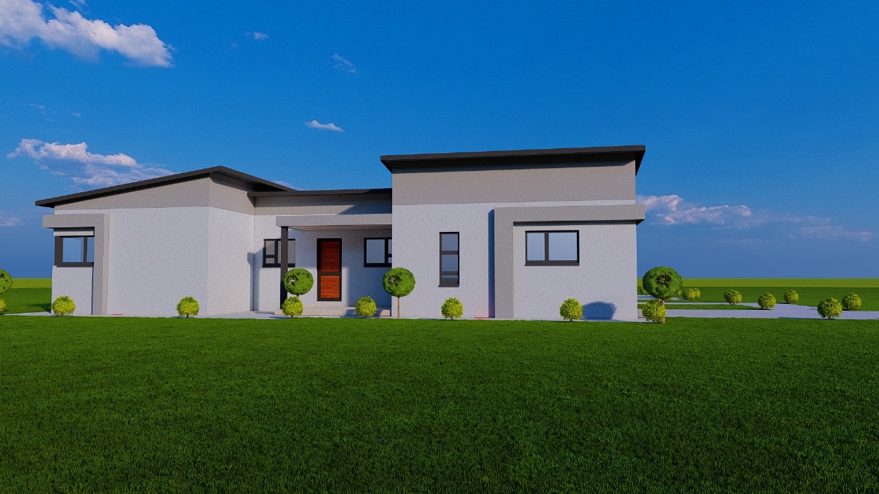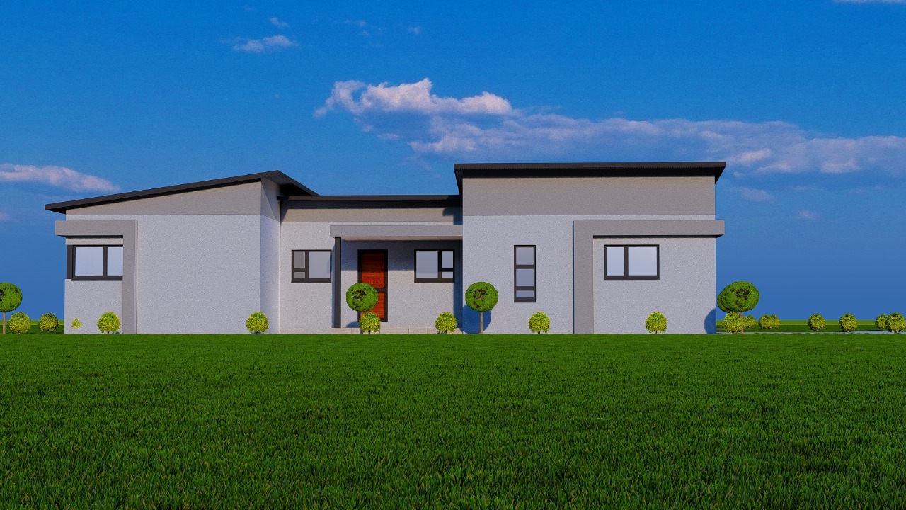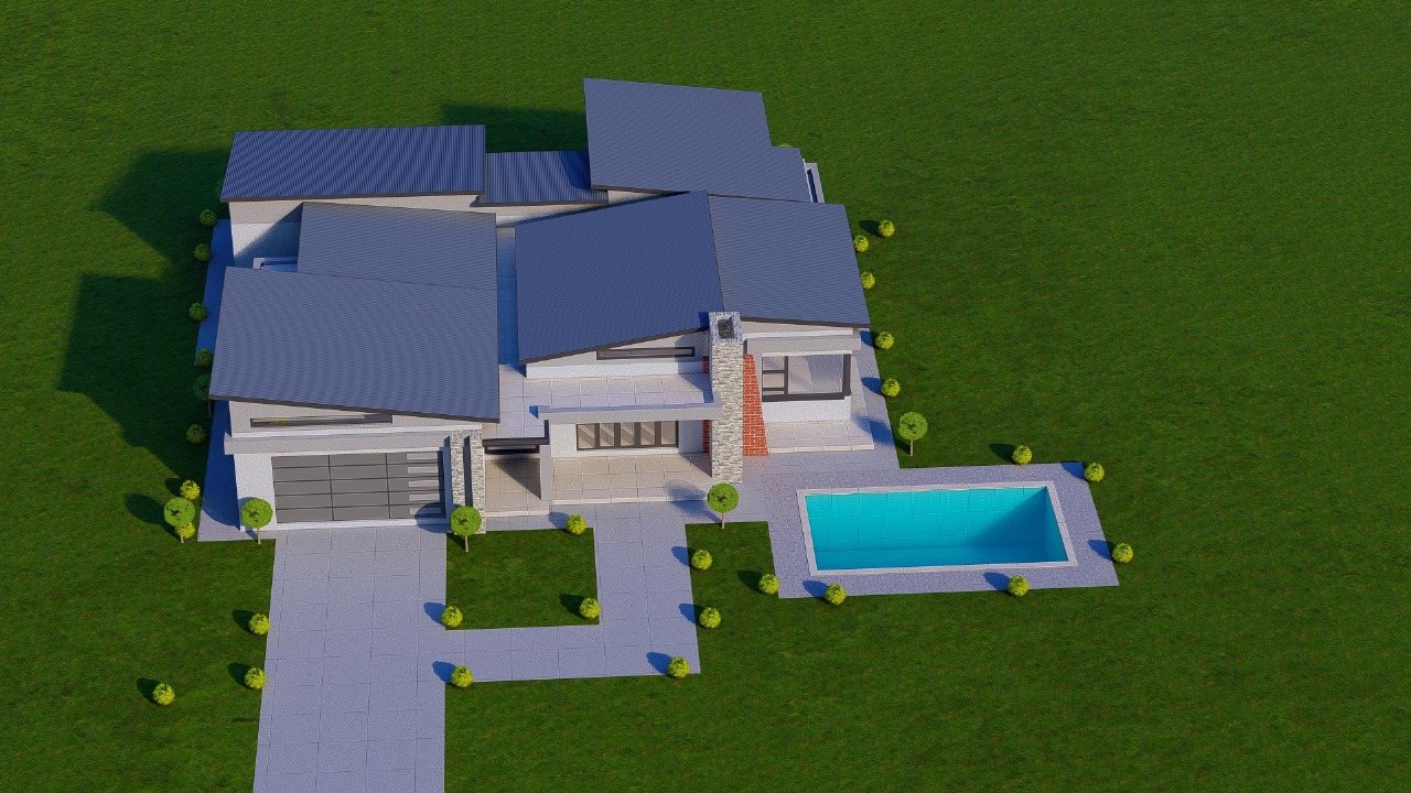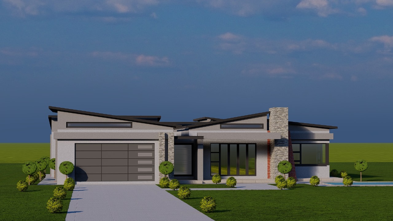 This contemporary single-story residence showcases a sophisticated blend of modern architectural design and functional living spaces. The home features a distinctive blue corrugated metal roof that complements the clean lines of the structure.