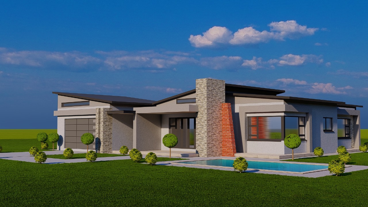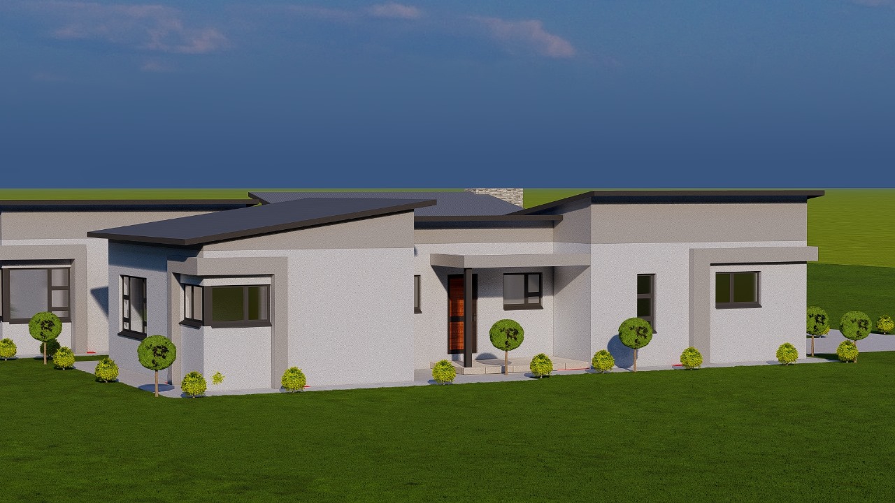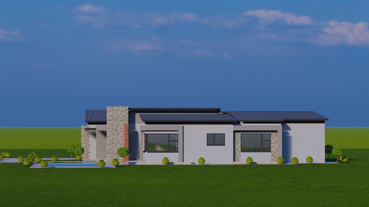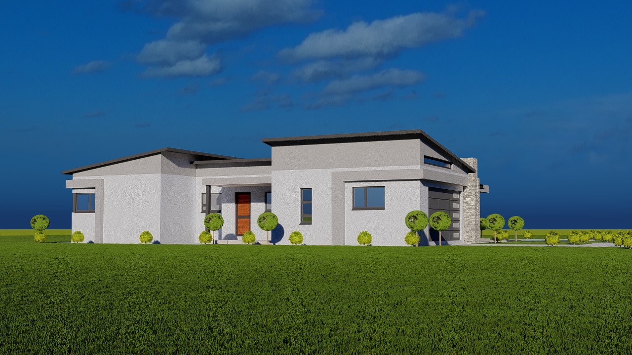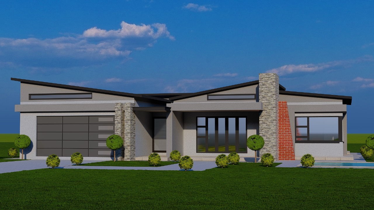 This contemporary single-story residence showcases a sophisticated blend of modern architectural design and functional living spaces. The home features a distinctive blue corrugated metal roof that complements the clean lines of the structure.