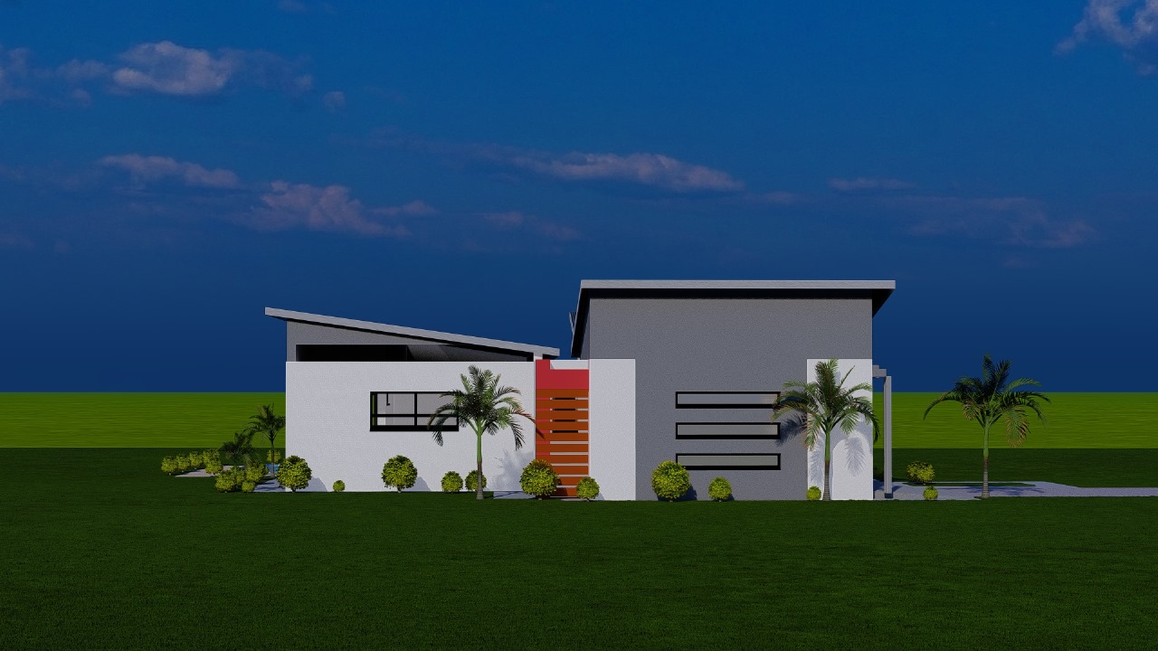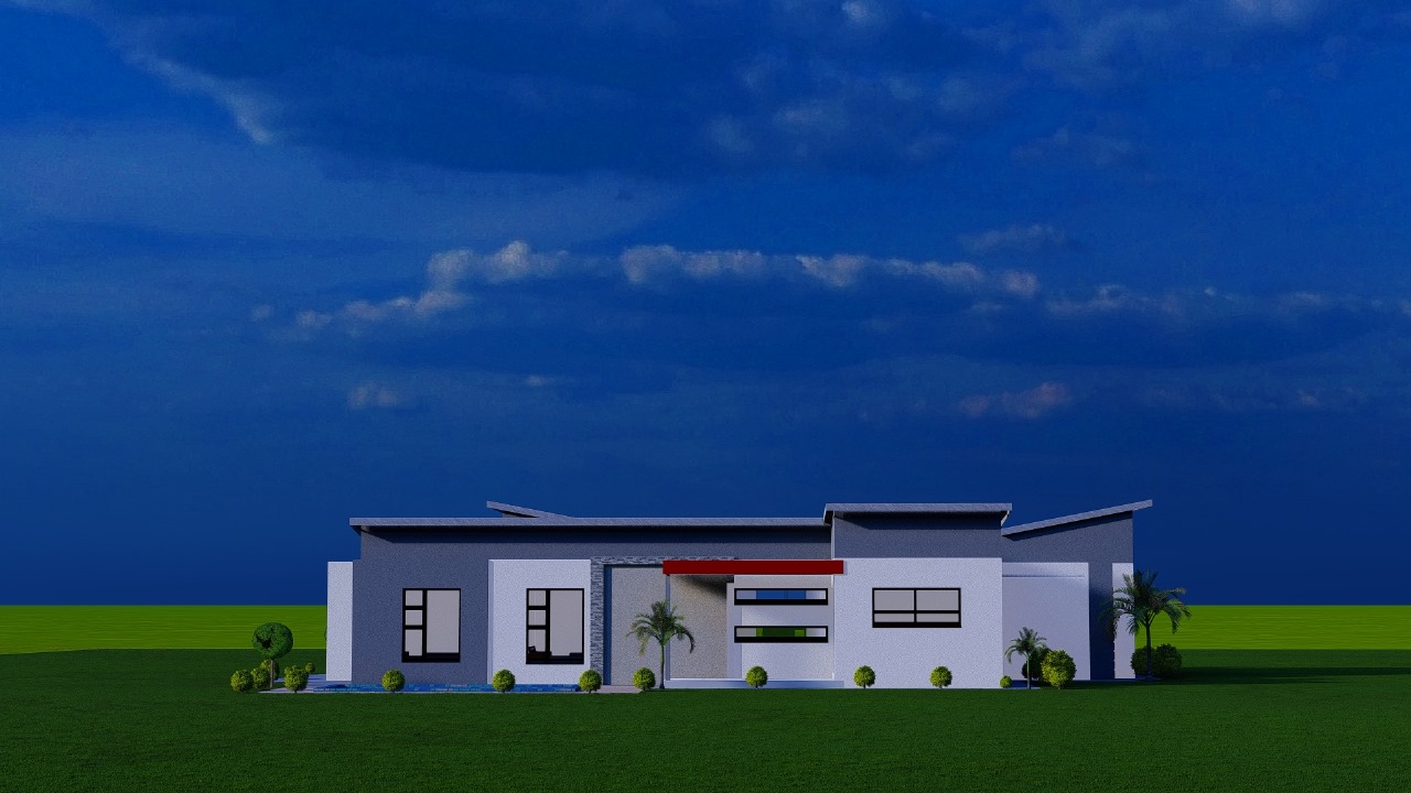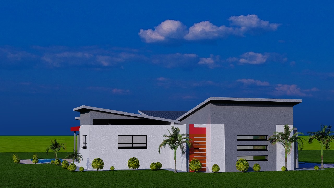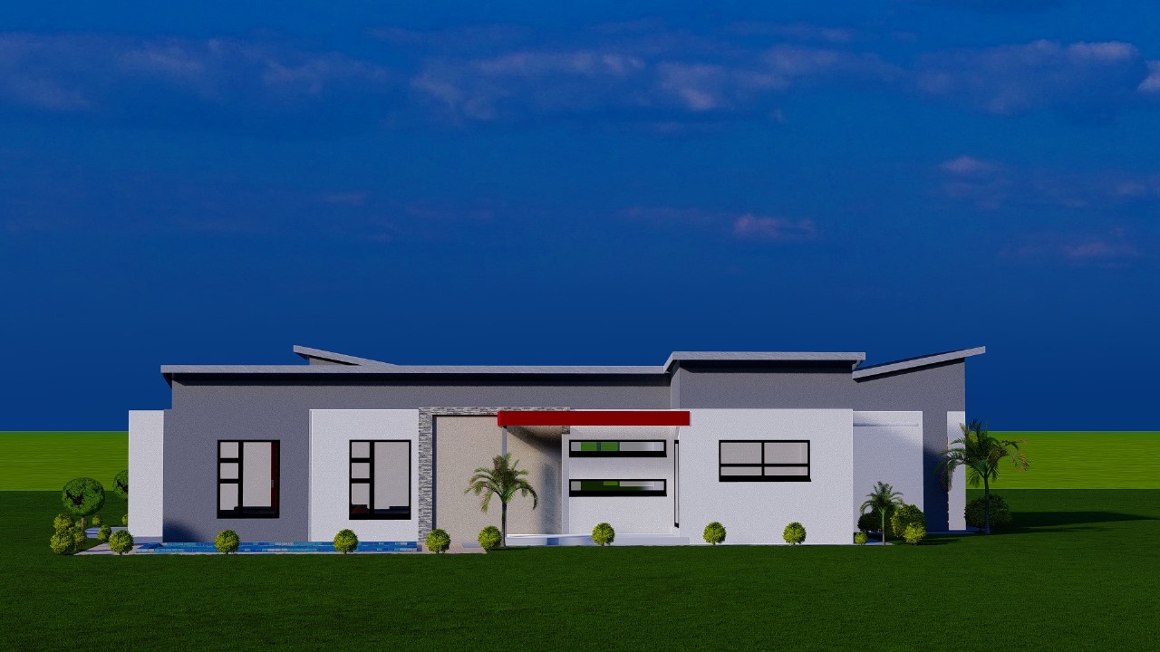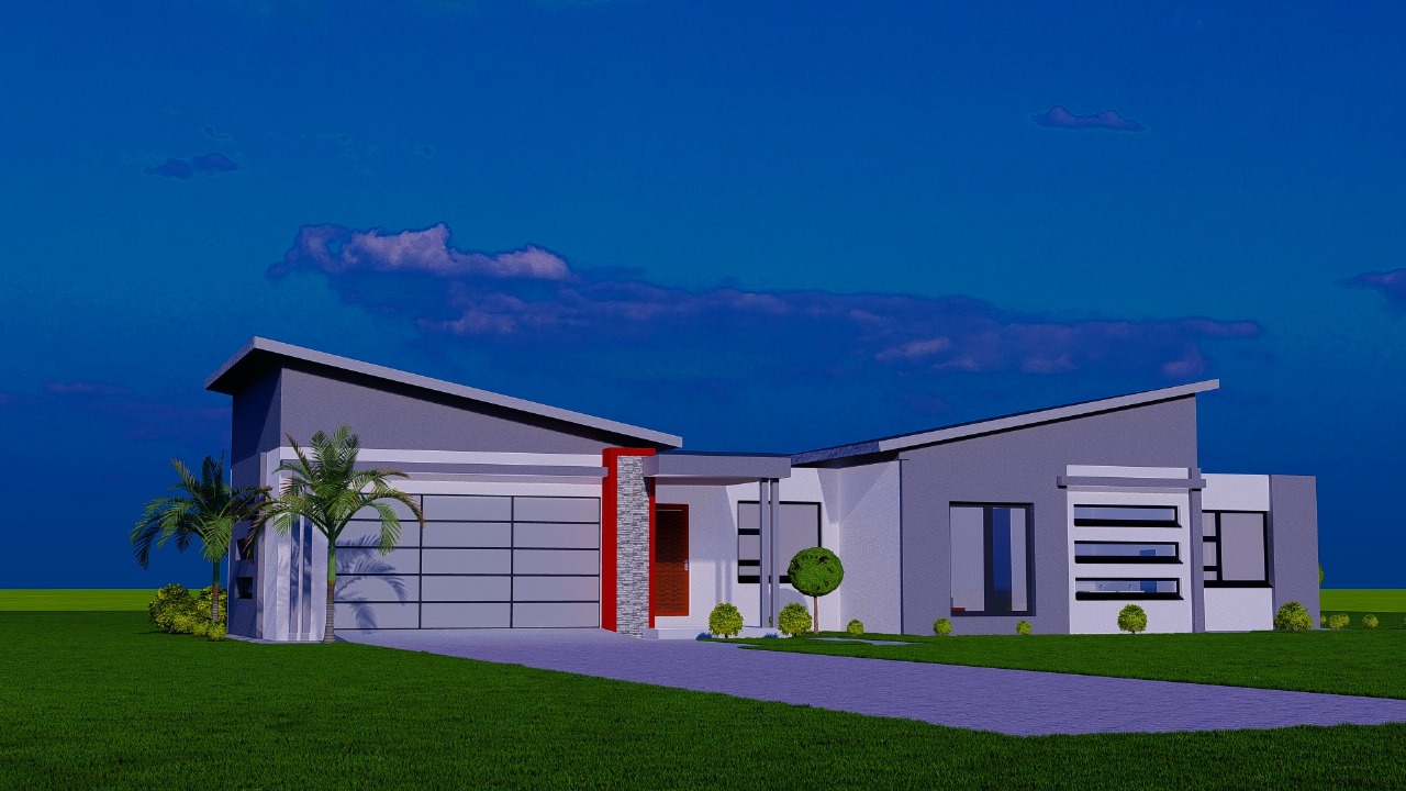 This sleek modern residence features a thoughtfully designed single-story layout with dynamic rooflines and clean architectural lines. The home showcases crisp white rendered walls accented with dark gray upper sections and bold red entry details that create striking visual interest.