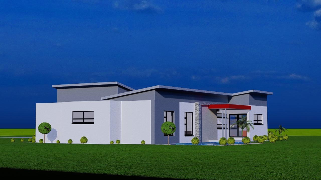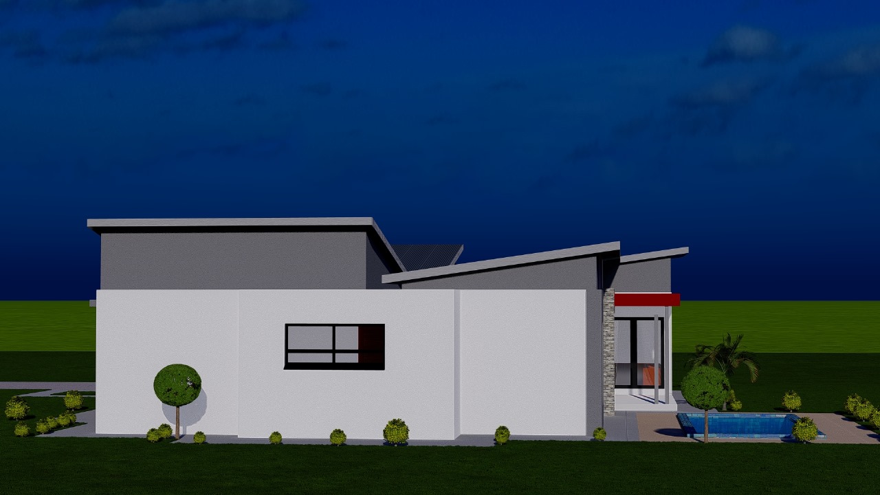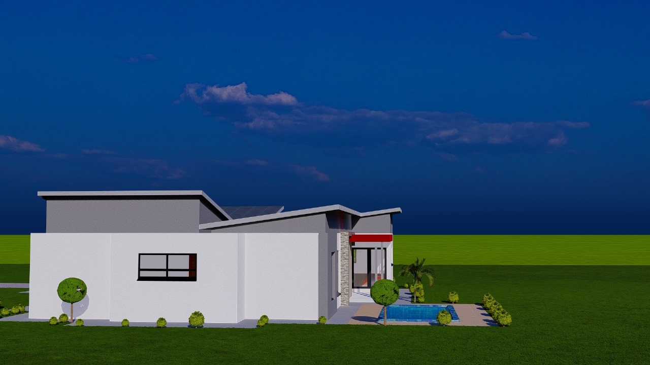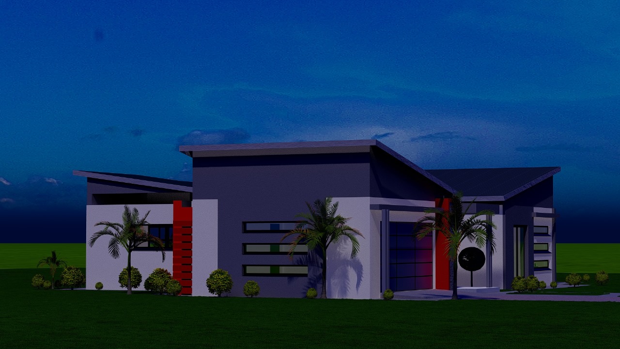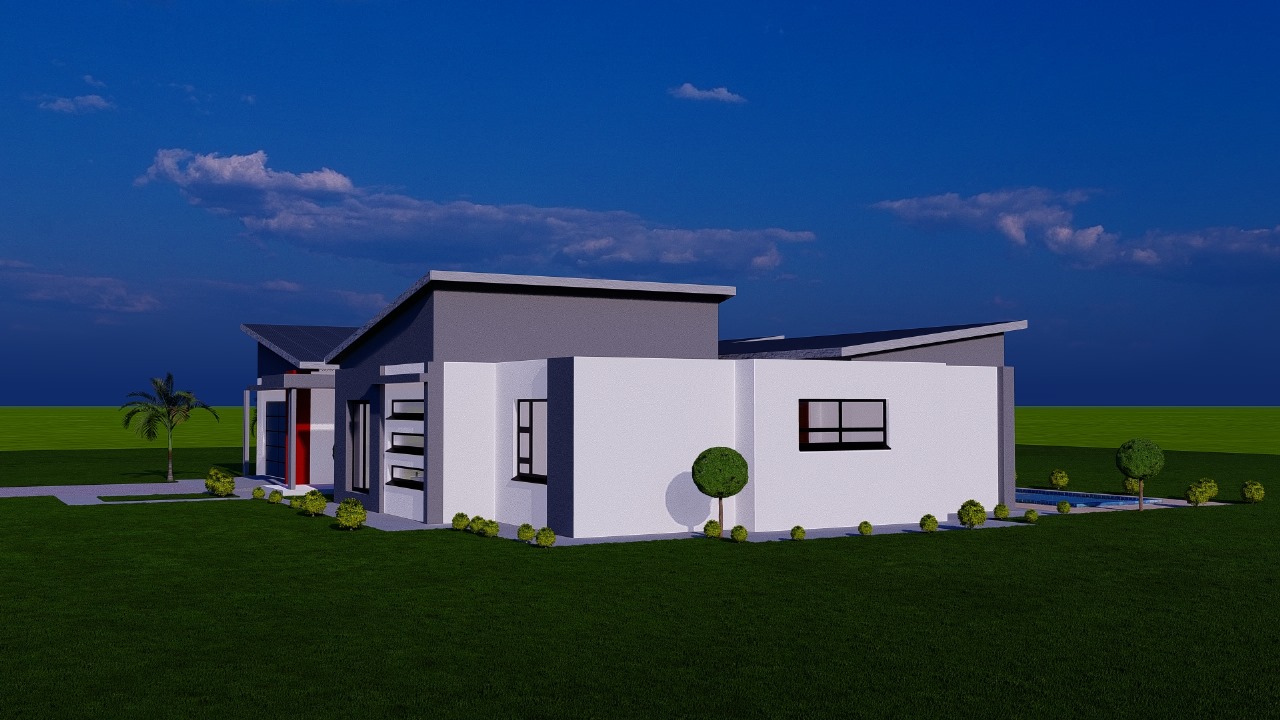 This sleek modern residence features a thoughtfully designed single-story layout with dynamic rooflines and clean architectural lines. The home showcases crisp white rendered walls accented with dark gray upper sections and bold red entry details that create striking visual interest.