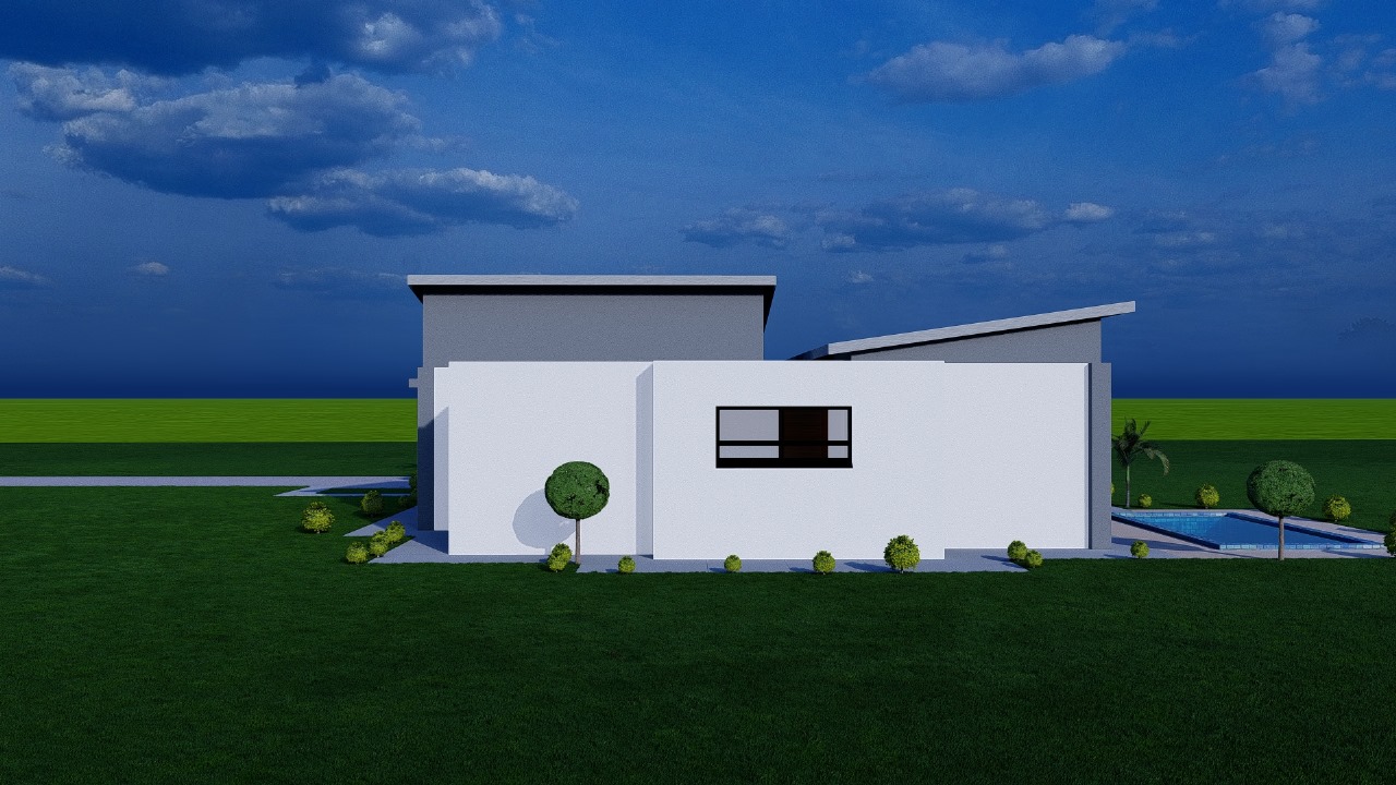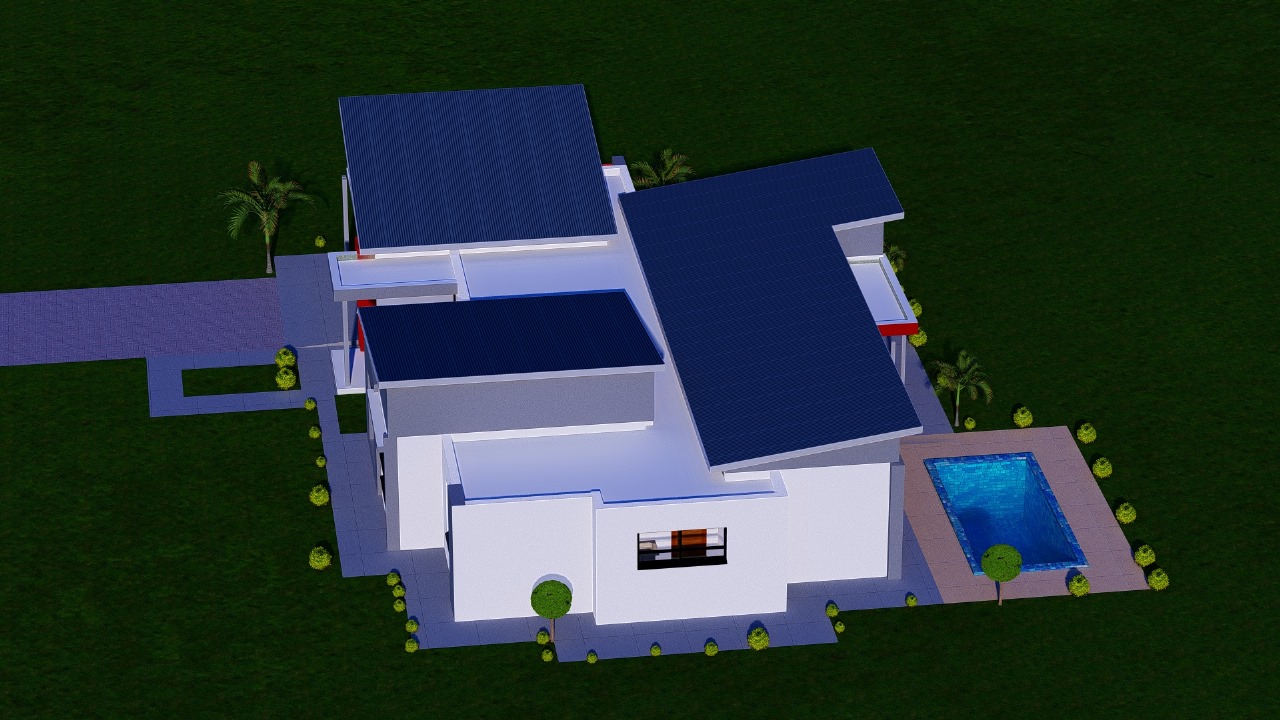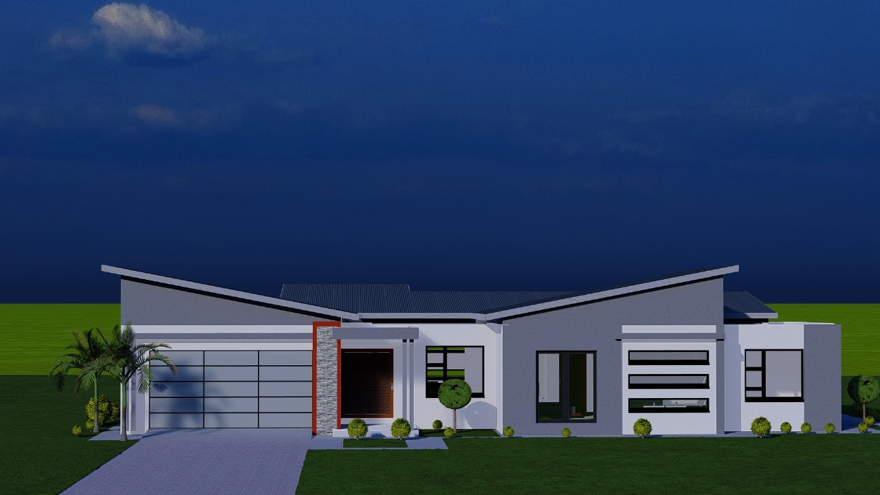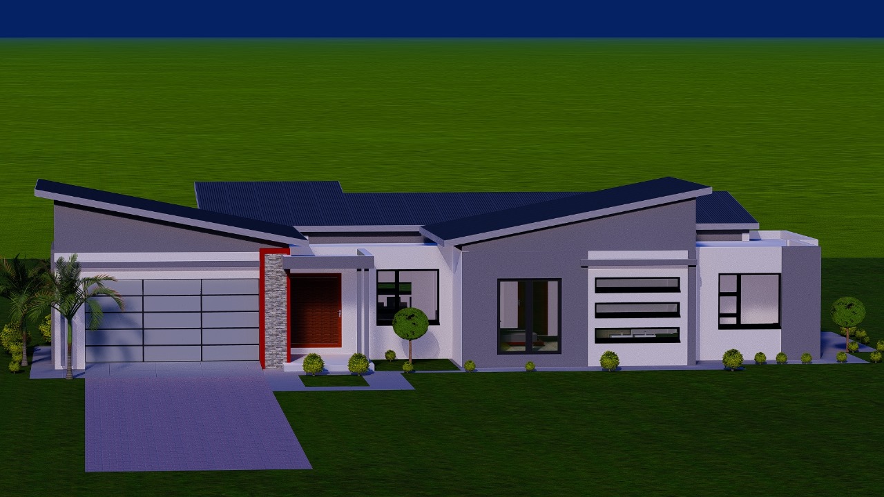 Multiple roof pitches at varying angles add depth and character to the profile, while strategic window placement ensures natural light throughout. The entrance features a covered portico with modern slatted screening, leading to well-proportioned interior spaces. An internal courtyard provides private outdoor access and natural ventilation.